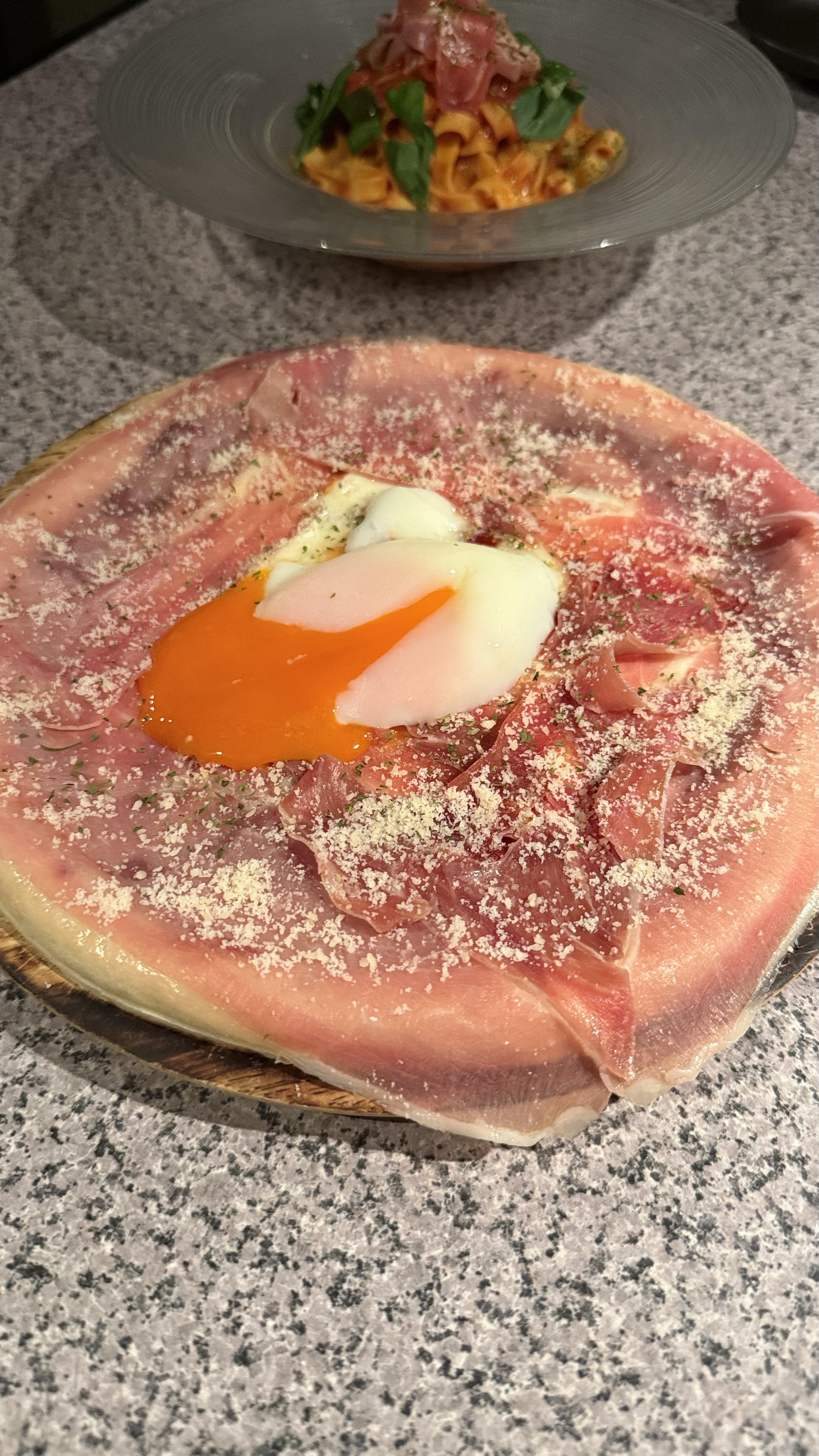 ・ハモンセラーノとモッツァレラのビスマルク風ピッツァ